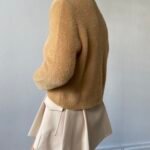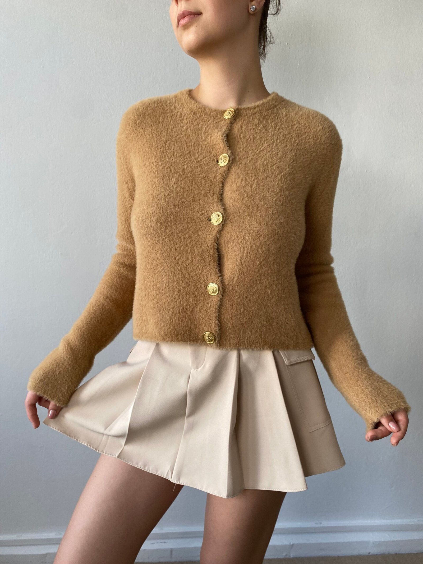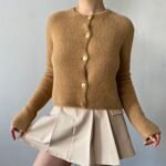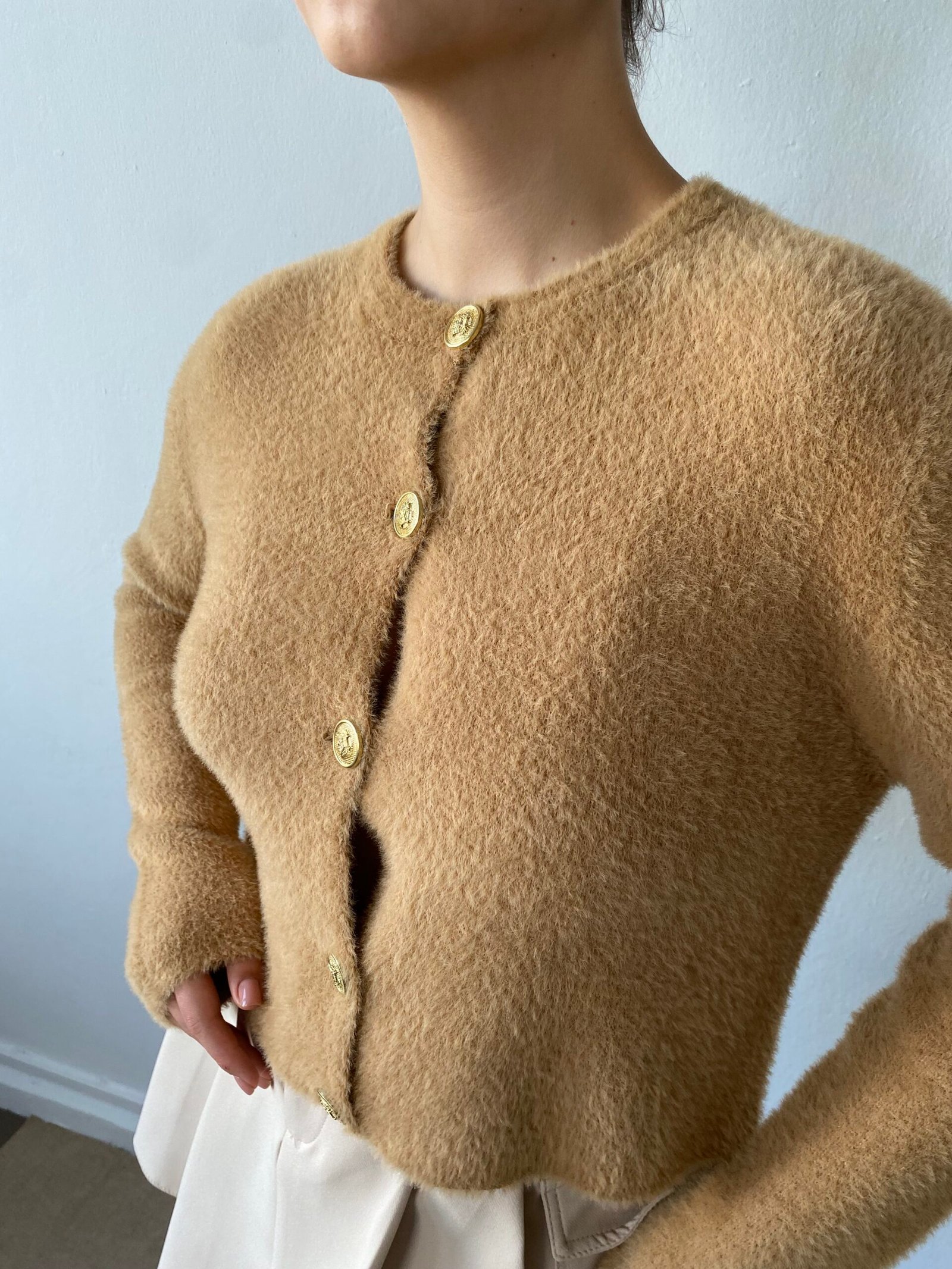 Trumpesnio modelio, moteriškas megztinis su aukso spalvos sagomis.