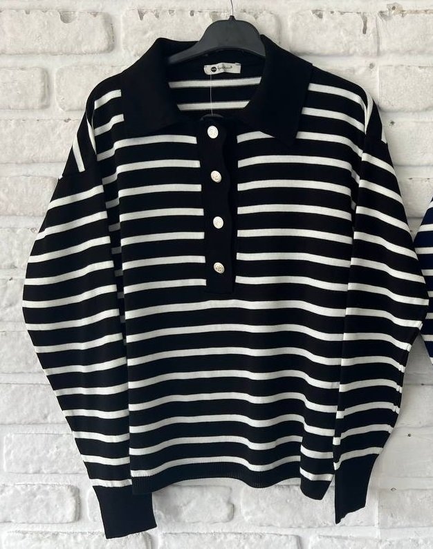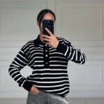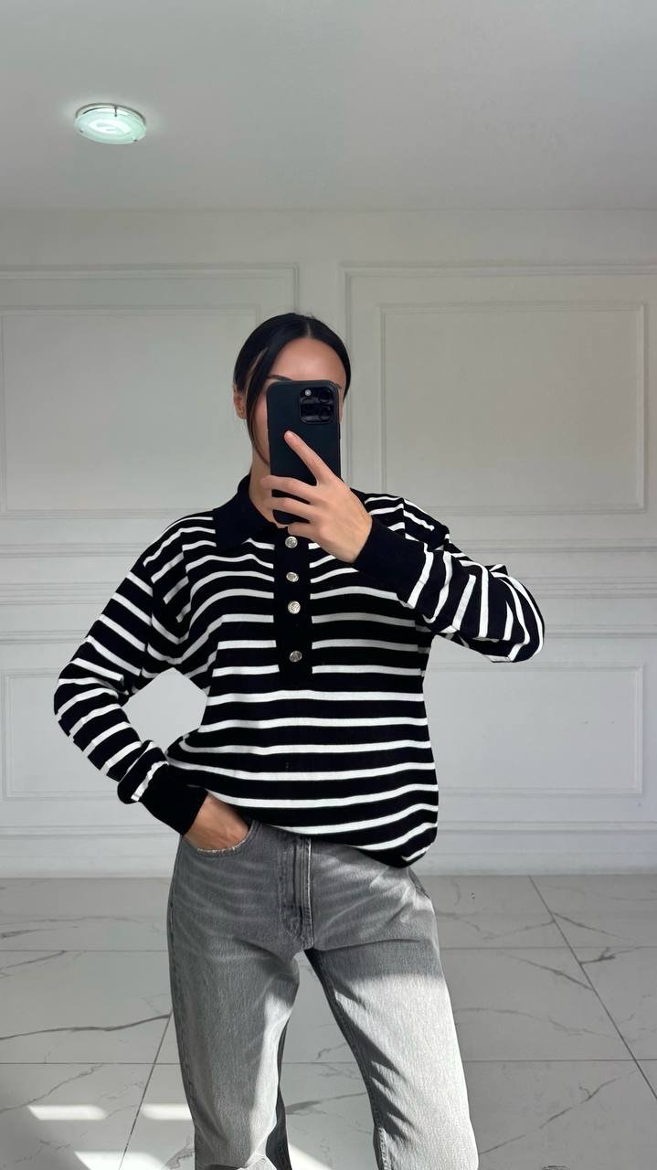 Moteriškas dryžuotas megztinis su polo kaklu.