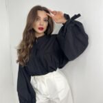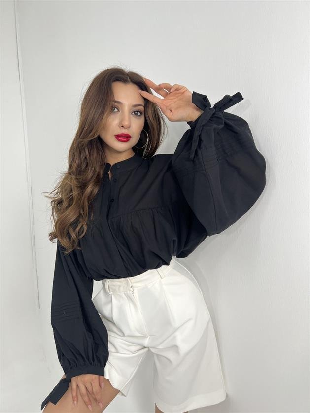 Moteriški laisvesnio modelio marškiniai. Lengvesnio audinio, užsagstomi, su pūstomis rankovėmis, rankovių galai užrišami.
