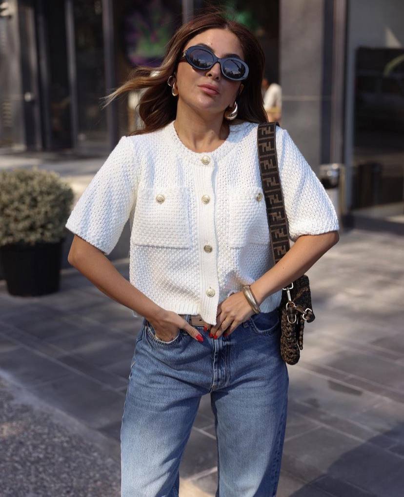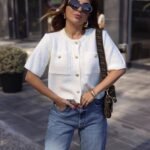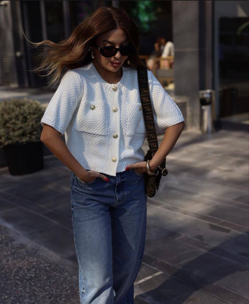Moteriška, trumpesnio modelio, megzto audinio palaidinė. Su kišenėlėmis, ausko spalvos sagomis, užsagstoma.