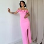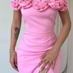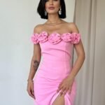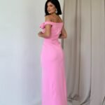 Ilga, moteriška priglundanti, suknelė su skeltuku priekyje. Suknelė atvirais pečiais, priekį puošia gėlių imitacijos papuošimas (gėles galima nusisegti), suknelė gale užsegama užtrauktuku.